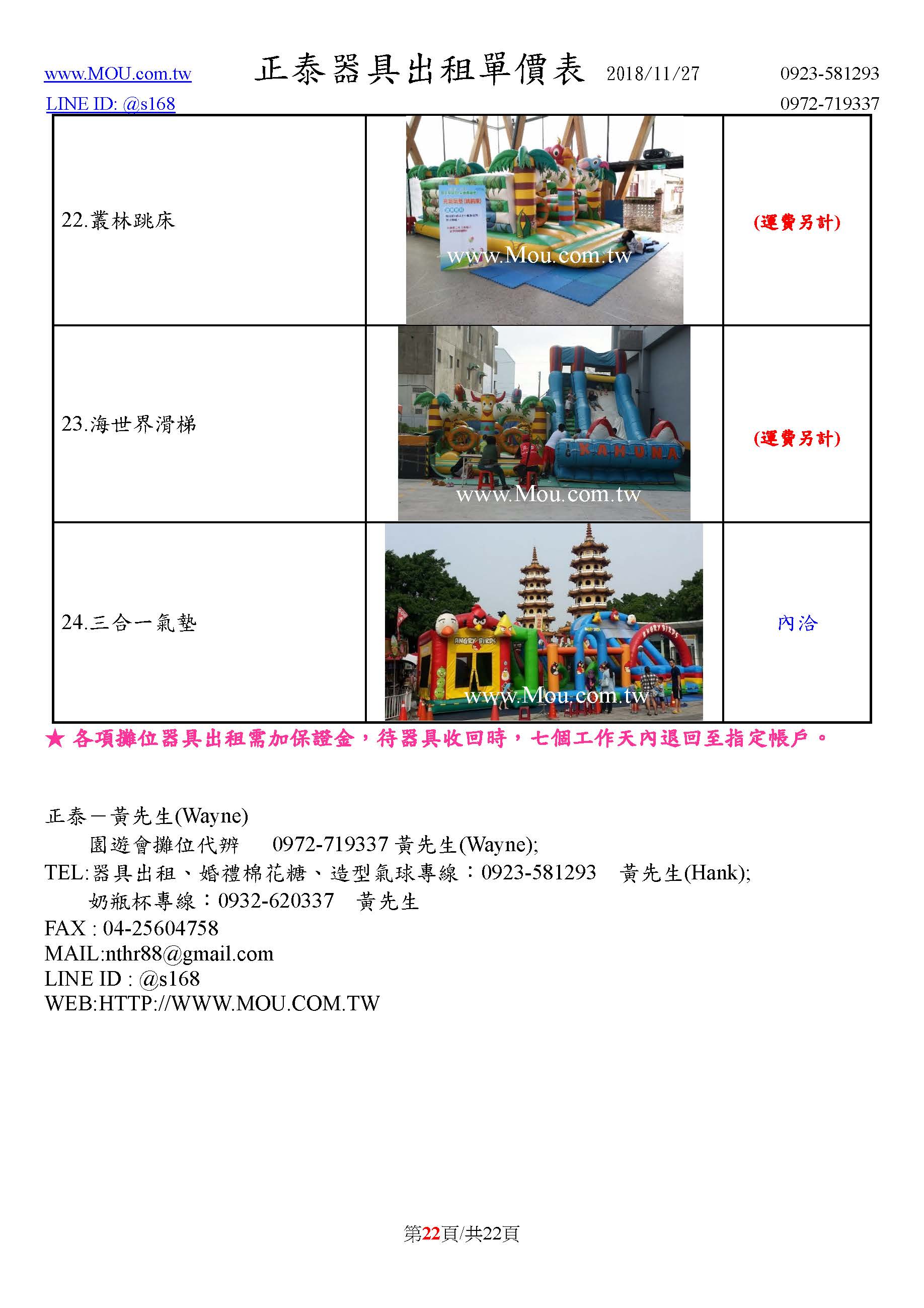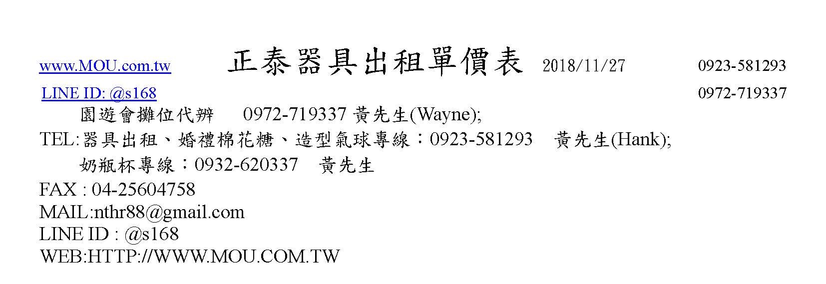 正泰園遊會策劃-黃先生(Wayne) 0972-719337黃先生(Wayne); TEL : 器具出租、婚禮棉花糖、造型氣球專線:0923-581293黃先生(Hank); FAX : 04-25604758 MAIL: nthr88@gmail.com Line : @s168 WEB : Http://www.MOU.com.tw Facebook: Http://fb.com/122tw